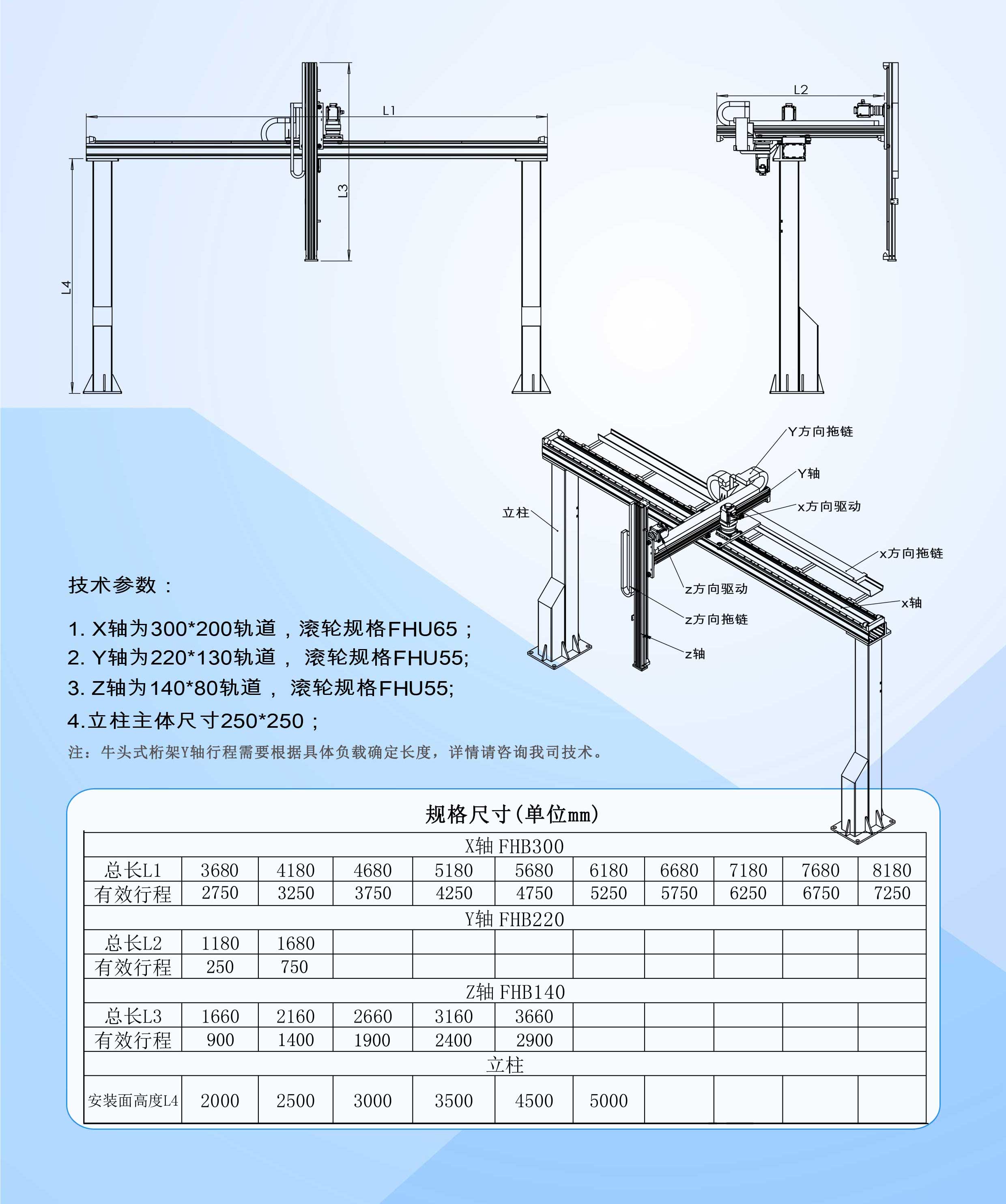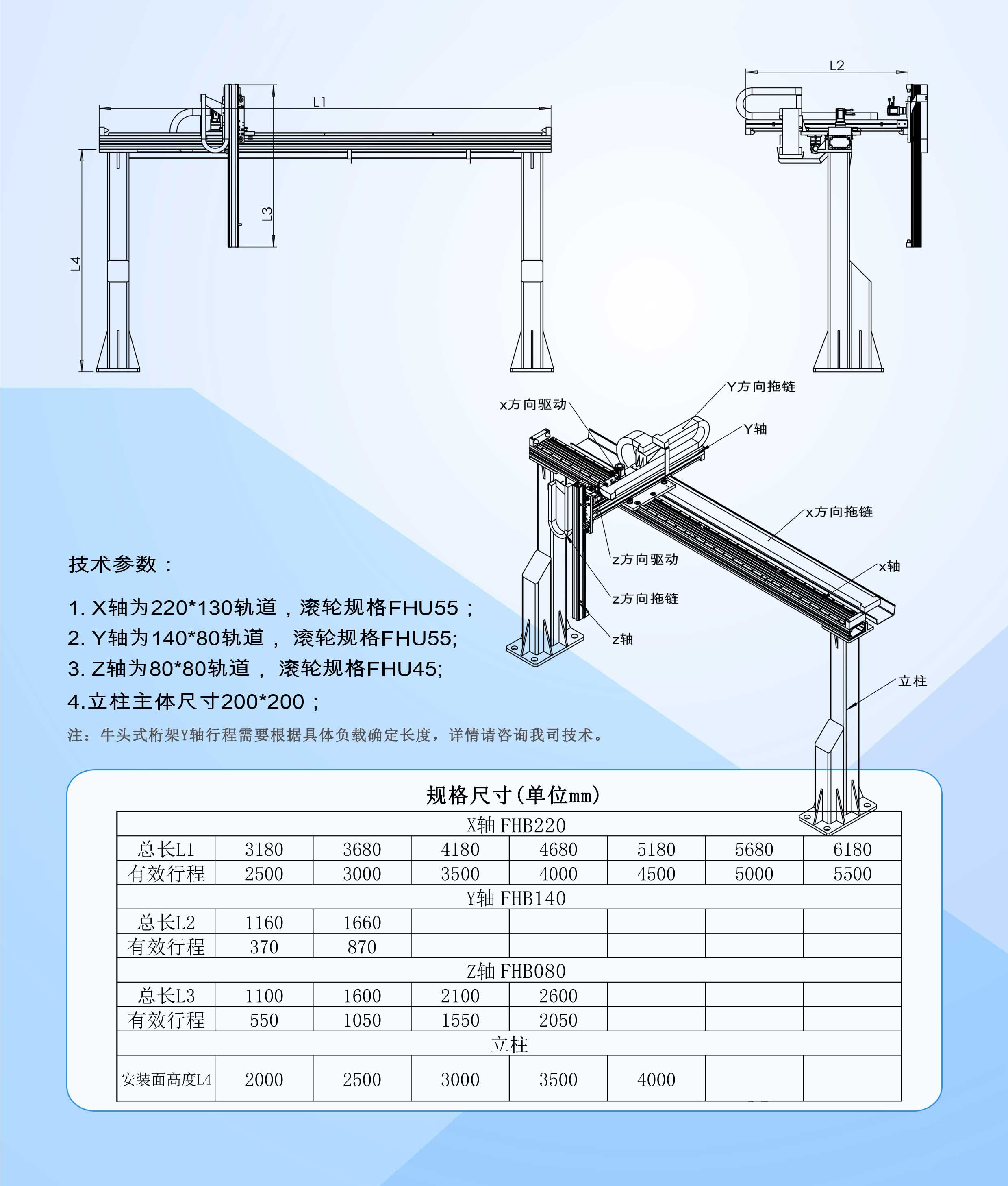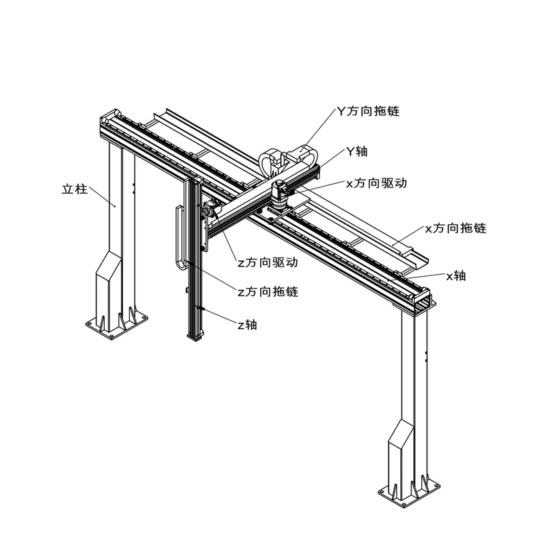悬臂桁架机械手的工作臂(X轴)通过一个悬臂结构(Y轴)支撑在X轴上,使其工作区域更加开阔,适用于需要覆盖广泛工作区域的应用场景。这种结构设计使得机械手能够在较大的范围内进行运动和操作,同时保持高灵活性和高承载能力。