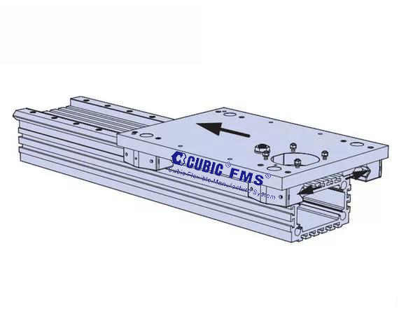 在导轨铝型材的平行布置两根导轨,其中一根导轨带齿条,滑座上可集成齿轮。