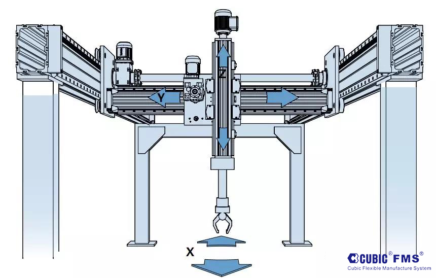 一根水平轴,一根垂直轴,如下是一个桁架机械手示意图: